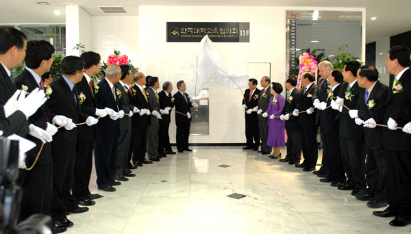 ¿©Àǵµ½Ã´ë¸¦ ¸¶°¨ÇÏ°í ¸¶Æ÷±¸ »ó¾Ïµ¿À¸·Î »ç¹«½ÇÀ» ¿Å±ä ´ë±³ÇùÀÌ 25ÀÏ ¿ª´ë ȸÀå´Ü°ú ´ëÇÐ ÃÑÀåµéÀÌ Âü¼®ÇÑ °¡¿îµ¥ »ç¹«½Ç ÀÌÀü °³¼Ò½ÄÀ» Çß´Ù. ´ë±³ÇùÀº Áö³­ 2¿ù 1ÀÏ Áö±ÝÀÇ »ó¾Ïµ¿À¸·Î ÀÌ»çÇϰí 25³â°£ÀÇ ¿©Àǵµ½Ã´ë¸¦ Á¢À¸¸ç ÇÑÃþ À§»óÀÌ °­È­µÈ °¡¿îµ¥ ´ëÇÐ ¹ßÀü°ú Áö¿øÀ» À§ÇÑ ¼­ºñ½º¸¦ ´ÙÁüÇß´Ù. À̳¯ °³¼Ò½Ä¿¡´Â Á¶¿Ï±Ô ´ë±³Çù 4´ë ȸÀå(Àü ±³À°ºÎÀå°ü)°ú À̱âÁØ 10´ë ȸÀå, º»Áö È«³²¼® ´ëÇ¥ÀÌ»ç, Á¤ºÎ °ü°èÀÚ µî 50¿©¸íÀÇ ³»¿ÜºóÀÌ Âü¼®ÇØ »ç¹«½Ç °³¼Ò¸¦ ÃàÇÏÇß´Ù. ÀÌÀ幫 ȸÀå(°¡¿îµ¥ ¿ÞÂÊ)°ú ¼Õº´µÎ Â÷±â ȸÀå(°¡¿îµ¥ ¿À¸¥ÂÊ) ¹× Âü¼® ³»¿ÜºóµéÀÌ ÇöÆÇ½ÄÀ» Çϰí ÀÖ´Ù.