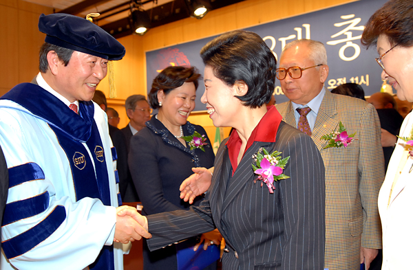 ÀÌÇöû Àü Çѱ¹´ëÇб³À°ÇùÀÇȸ »ç¹«ÃÑÀåÀÌ 15ÀÏ »ó¸í´ë Á¦8´ë ÃÑÀå¿¡ ÃëÀÓÇß´Ù. ÀÌÃÑÀåÀÇ ÃëÀӽĿ¡´Â Á¶¿Ï±Ô, À±Çü¼·, ¹Ú¿µ½Ä Àü ±³À°ºÎÀå°ü°ú ÀÌ»óÁÖ Àü ±³À°ºÎÃѸ®, À̰æ¼÷ ¼÷¸í¿©´ë ÃÑÀå, ÀÌõ¼ö ´ëÁø´ë ÃÑÀå, ±è¹ÎÇÏ Àü Áß¾Ó´ë ÃÑÀå µî ÀüÁ÷ ±³À°ºÎÀå°ü°ú Àü.ÇöÁ÷ ÃÑÀåµéÀÌ ´ë°Å Âü¼®ÇØ ÀÌ ½ÅÀÓÃÑÀåÀÇ ÃëÀÓÀ» ÃàÇÏÇß´Ù. ÀÌÃÑÀåÀº Áö³ 1998³âºÎÅÍ 2006³â±îÁö 8³â°£ ´ë±³Çù 5, 6´ë »ç¹«ÃÑÀåÀ» ¿ªÀÓÇÏ¸ç ´ë±³ÇùÀÇ ÇöÀç À§»óÀÇ ±â¹ÝÀ» ´Û¾Æ³õÀº°ÍÀ¸·Î Æò°¡¹Þ°í ÀÖ´Ù. ÀÌÃÑÀå(¿ÞÂÊ)ÀÌ ÃëÀÓ½Ä Á÷ÈÄ ´Ü»ó¿¡¼ À̰æ¼÷ ¼÷¸í¿©´ë ÃÑÀå°ú Àλ縦 ³ª´©°í ÀÖ´Ù. ¸Ç ¿À¸¥ÂÊÀº Àå»ó Àü ÀÌÈ¿©´ë ÃÑÀå.