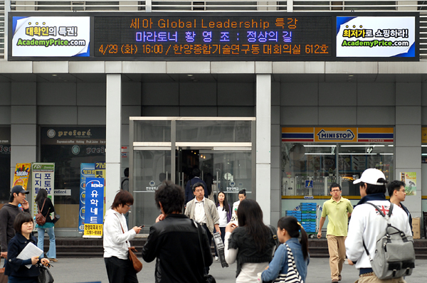 ÇѾç´ë¿¡ ÃÖ±Ù Çö¼ö¸·À» ´ëüÇÏ´Â ´ëÇü LED Àü±¤ÆÇÀÌ ¼³Ä¡ °¡µ¿µÅ Çлýµé·ÎºÎÅÍ Å« È£ÀÀÀ» ¾ò°í ÀÖ´Ù. ´ëÇÐ ³» ¹«Áú¼­ÇÑ °Ô½Ã¹®È­¸¦ °³¼±Çϱâ À§ÇØ Ã·´Ü µðÁöÅй̵ð¾î ½Ã½ºÅÛÀ¸·Î ´ëüÇÏ´Â Çѱ¹´ëÇнŹ®ÀÇ 'Ŭ¸°&Á¤º¸È­Ä·ÆÛ½º ¿îµ¿'¿¡ Áö³­ÇغÎÅÍ Âü¿©Çϰí ÀÖ´Â ÇѾç´ë¿¡ »õ·Î ¼³Ä¡µÈ LED´Â 6mx1m Å©±â·Î Á¤¹®°ú ÇѾçÇÁ¶óÀÚ ¿Üº®(»çÁø), Áß¾Óµµ¼­°ü ÀÔ±¸ µî 3°÷¿¡ ¼³Ä¡µÅ ÁÖ¿ä °øÁö»çÇ×À» Ç¥ÃâÇÑ´Ù. ÇѾç´ë¿¡´Â À̿ܿ¡µµ º®º¸¸¦ ´ëüÇÏ´Â ´ë¾È¸ÅüÀÎ LMB 26´ë¿Í ÀÎÅͳÝÀ» °áÇÕÇÑ µðÁöÅР÷´Ü¸ÅüÀÎ ÀÎŰ(inki) 27´ë°¡ À¯µ¿ÀÌ ¸¹Àº °Ç¹°¿¡ ¼³Ä¡µÅ ÀÖ´Ù.