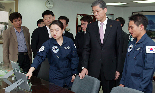 Çѱ¹ ù ¿ìÁÖÀÎ À̼ҿ¬¾¾(¾Õ ¿ÞÂÊ)¿Í °í»ê¾¾(¿À¸¥ÂÊ)°¡ 16ÀÏ ±³°úºÎ¸¦ ¹æ¹®ÇØ ±èµµ¿¬ Àå°ü¿¡°Ô ¿ìÁÖÀÓ¹« ¼öÇà Àü¹Ý¿¡ ´ëÇÑ °á°ú¸¦ º¸°íÇß´Ù. À̼ҿ¬¾¾°¡ ±èÀå°ü(°¡¿îµ¥)¿¡°Ô ISS¿¡¼ ¼öÇàÇÑ ¿ìÁÖ½ÇÇèÀÇ ÀϺθ¦ ¼³¸íÇϰí ÀÖ´Ù.