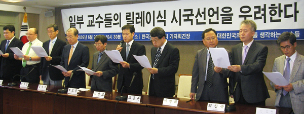 ´ëÇÐ ±³¼öµéÀÇ ½Ã±¹¼±¾ðÀÌ º¿¹° ÅÍÁöµí ´ëÇк°·Î ÀÕµû¸£°í ÀÖ´Â °¡¿îµ¥ ÀÌ·¯ÇÑ ¸±·¹ÀÌ½Ä ½Ã±¹¼±¾ðÀ» ¿ì·ÁÇϸç ÀÚÁ¦¸¦ Ã˱¸ÇÏ´Â ±³¼ö¿Í º¸¼ö´ÜüµéÀÇ ±âÀÚȸ°ßµµ ÀÕµû¸£°í ÀÖ´Ù. ¹ÚÈ¿Á¾ ¼¿ï´ë ±³¼ö¿Í ¾È¼¼¿µ ¼°´ë ±³¼ö µî `´ëÇѹα¹ÀÇ ¹Ì·¡¸¦ »ý°¢ÇÏ´Â ±³¼öµé' ¸íÀÇÀÇ 130¿© ¸íÀ¸·Î ±¸¼ºµÈ ±³¼öµéÀº 9ÀÏ ¼¿ï ÇÁ·¹½º¼¾ÅÍ¿¡¼ ±âÀÚȸ°ßÀ» ¿°í ÀϺΠ±³¼öµéÀÇ ½Ã±¹¼±¾ð¿¡ ¿ì·Á¸¦ Ç¥Çß´Ù. À̳¯ ¸ðÀÎ ±³¼öµéÀº ±âÀÚȸ°ß¹®À» ÅëÇØ "00´ëÇÐ ±³¼ö Àϵ¿"À̶ó¸ç ¹ßÇ¥ÇÏ´Â ½Ã±¹¼±¾ðÀÌ ´ëÇÐ ÀüüÀÇ Àǰßó·³ »çȸ¿¡ ºñÄ¡°Ô Çϴ ŵµ´Â ¹Ù¶÷Á÷ÇÏÁö ¸øÇÏ´Ù°í ÁöÀûÇß´Ù.