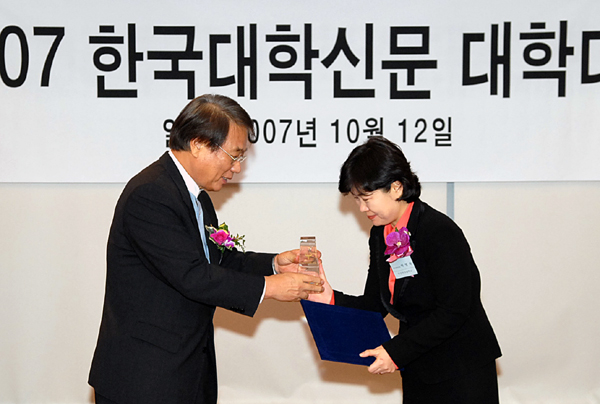 2007 Çѱ¹´ëÇнŹ® ´ëÇдë»ó ½Ã»ó½ÄÀÌ 12ÀÏ ¿ÀÈÄ ¼¿ï ÀåÃæµ¿ ¼¿ïŬ·´¿¡¼ ¿·È´Ù. º»»ç°¡ ÁÖ°üÇÑ ´ëÇдë»óÀº ÀçÁ¤ÀÚ¸³ ¿ì¼ö´ëÇÐ(°Ç±¹´ë), Ãë¾÷Áö¿ø ¿ì¼ö´ëÇÐ(µ¿¾ç´ë), ±Û·Î¹ú ÀÎÀç¾ç¼º ¿ì¼ö´ëÇÐ(Çѱ¹¿Ü´ë) µîÀÇ ºÐ¾ß¿¡¼ ÃÑ 30°³ ´ëÇÐÀÌ ¼ö»óÇß´Ù. ÀÌÀοø º»Áö ȸÀå(¿ÞÂÊ)ÀÌ ±³À°Á᫐ ¿ì¼ö´ëÇÐÀ¸·Î ¼±Á¤µÈ ´ö¼º¿©´ë ¹Ú¸í¼÷ ´ë¿ÜÇù·ÂóÀå¿¡°Ô »óÆÐ¸¦ Àü´ÞÇϰí ÀÖ´Ù.