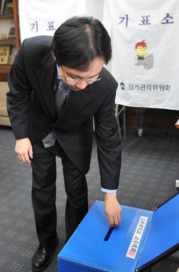 °í·Á´ë Á¦18´ë ÃÑÀåÈĺ¸ÀÚ ¿¹ºñ½É»ç¸¦ À§ÇÑ Àüü±³¼öÅõÇ¥°¡ 23ÀÏ °¢ ´Ü°ú´ëº°·Î ¼³Ä¡µÈ ÅõÇ¥¼Ò¿¡¼ ½Ç½ÃµÆ´Ù. ¸ðµÎ 10¸íÀÇ Èĺ¸ÀÚ°¡ Ã⸶ÇÑ °í·Á´ë ÃÑÀå¼±°Å´Â ¿¹ºñÅõÇ¥¿¡¼ 10%ÀÌ»ó µæÇ¥ÇÑ Èĺ¸ÀÚ¸¦ ÃÑÀåÈĺ¸ÀÚÃßõÀ§¿øÈ¸(ÃÑÃßÀ§)¿¡, ´Ù½Ã ÃÑÃßÀ§¿¡¼ ¼±Á¤ÇÑ 3¸íÀÇ Èĺ¸ÀÚ¸¦ ´ë»óÀ¸·Î ÀÌ»çȸ°¡ ´ÙÀ½´Þ ¸» ÀûÀÓÀÚ¸¦ ÃÖÁ¾ ¼±ÀÓÇÏ°Ô µÈ´Ù.